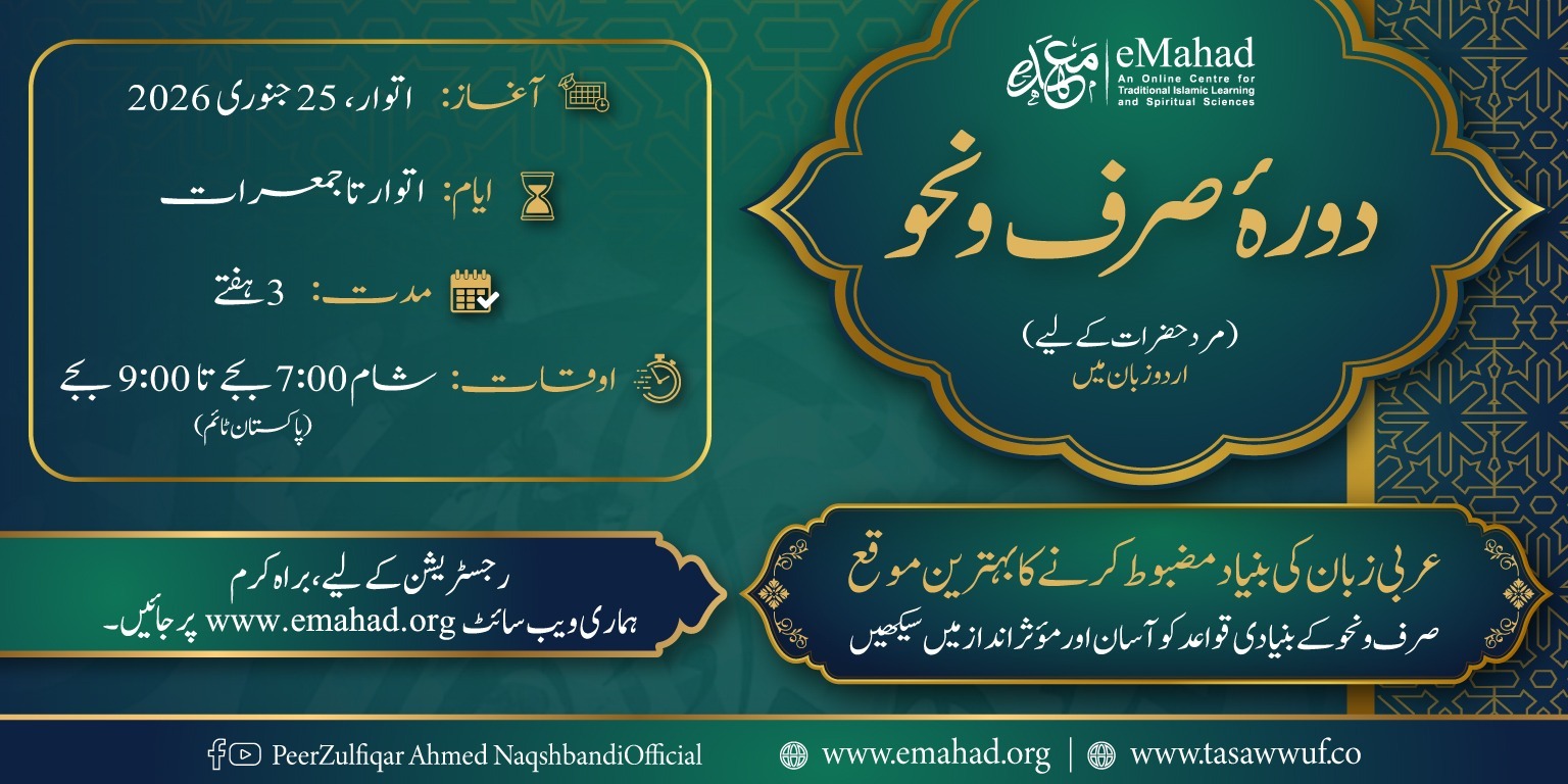 eMahad.com is an online centre for traditional Islamic learning and spiritual sciences under the supervision of Shaykh Zulfiqar Ahmad Naqshbandi (db).This initiative endeavours to provide quality education in various traditional Islamic disciplines and to cater to the global demand of authentic Islamic teachings. The programs are offered in English and in Urdu. Our courses are designed to connect an average Muslim to the rich scholarly tradition of Ahlus Sunnah wal Jama’a through a modern approach.